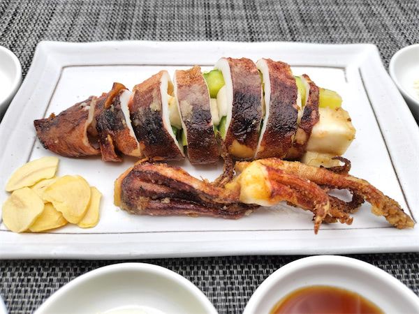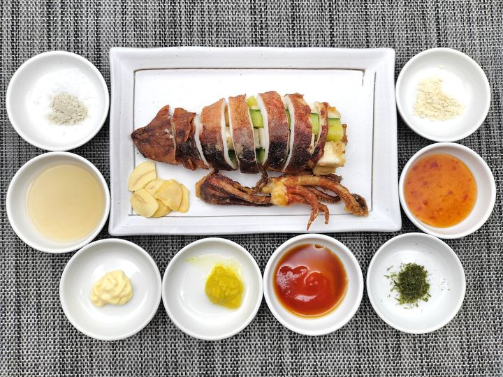 一目見るとよくあるイカの姿焼きのようですが、よく見るとイカの中に緑の何かと白い何かが入っているのが分かります。恐る恐る食べてみると、サクッとした衣とイカのプリっとした食感、きゅうりと山いものホクホク感とシャキシャキ感が口の中で混ざり合い何とも不思議な感じがします。それ自体は食材の味と揚げ油の味なのですが、用意した8種類のトッピングをそれぞれ付けて食べてみると、ポテトやナゲットを味の違うソースで食べるような別々の違った味わいが楽しめます。