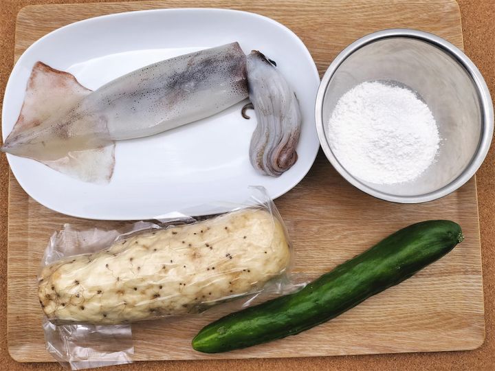 これも定かではないですが、きゅうりと一緒に入っているのは豆薯らしいです。豆薯はヒカマとも言いますが、葛に似ているのでクズイモとも言うそうです。どこで売っているかすら分からないので、今回は火を入れるととろとろになる山いも(大和いも)を使いました。