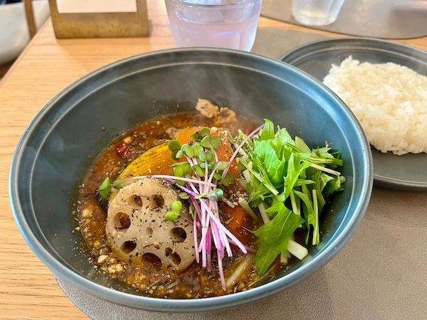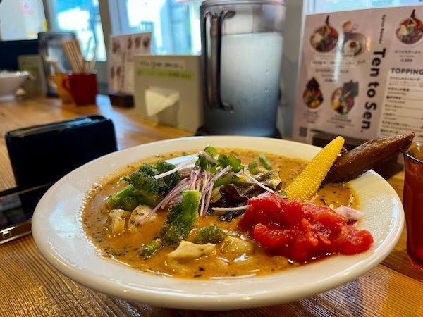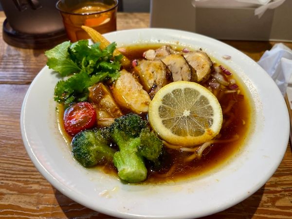 札幌の人気スープカレー専門店で下北沢にも支店があるRojiura Curry SAMURAI.系のスパイスラーメンの店。フェスメニュー「華麗なタンドリーチキンラーメン」(1500円)はタンドリーチャーシュー麺とマサラ中華そばの融合でしょうか。メニュー名にカレーじゃなく華麗とか持ってくるところも愛おしい。 初めてなら華やかな野菜がおいしい定番「スパイスラーメン」を。筆者は素揚げのごぼうが大好きです。