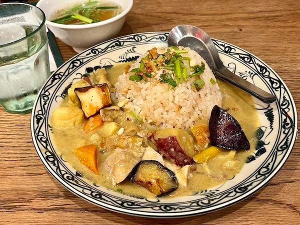 駅前のMIKAN下北沢の中の1店。こちらの牛すじとトマトのフォーが筆者の定番メニュー。フェスメニューの「鶏肉とさつま芋のベトナムカレー」(900円)は甘いカレーかと敬遠気味でしたが、実は甘いのはさつま芋のみ。フォーのスープのような豊かな出汁がキリッと効いたカレールーには彩り良い野菜。ご飯はベトナム鶏飯。食べ始めたら止まらない味わいでした。