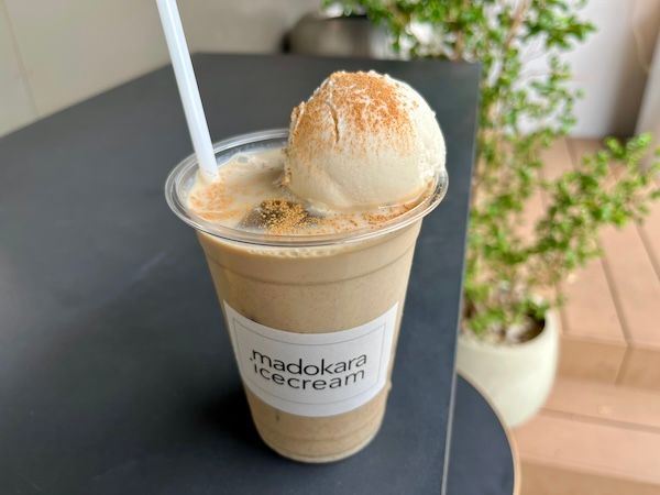 途中で気分を変えて次のカレーがまた新鮮に楽しめるように間に挟みたいのがスイーツやドリンク。ナンセイプラスにある胃袋にズキュン(正確にはお店の窓部分にあるマドカラアイスでテイクアウトしてテラスでいただきました)「自家製和チャイフロート」(780円)これは香り豊かなチャイ。自家製アイスの美味しさがたまりませんでした。