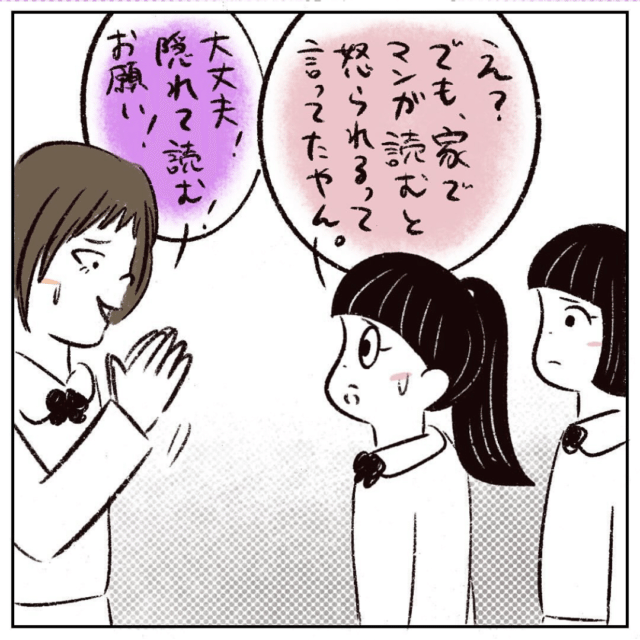「え?でも家でマンガ読むと怒られるって言ってたやん。」以前と言っていることが違ったので聞いてみると「大丈夫!隠れて読む!お願い!」と言われました。