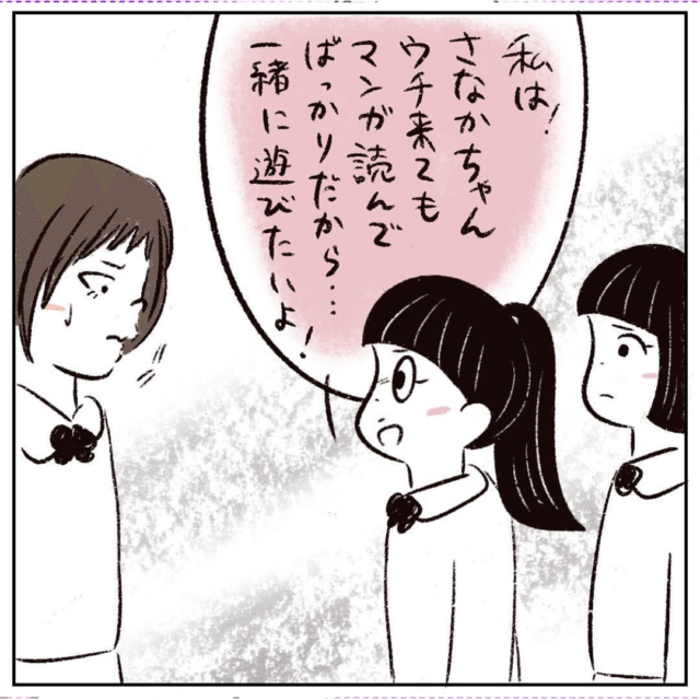 それを聞いたまるさんは「私は!さなかちゃんウチに来てもマンガ読んでばっかりだから一緒に遊びたいよ!」とさなかちゃんに伝えました。