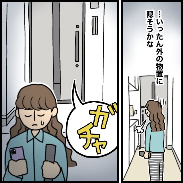 散々言い合いした後、スマホとリモコンを持ったママは、「一旦外の物置に隠そうかな」と玄関を出ました。すると、「ガチャ」玄関のドアが閉まる音がしました。