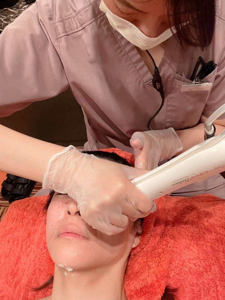 看護師さんの手際のいいこと! クルクルと緩みの気になる部分にピンポイントで当てていきます。肌温は40度に温められます。若干熱さはありますが、我慢できないほどではなく、慣れるとじんわり気持ちいい~!