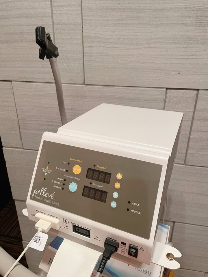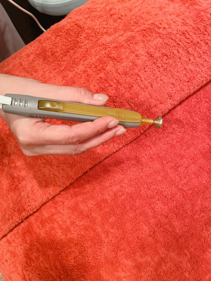 こちらがペレヴェの機械です。この小さなヘッド部分を、ジェルを塗った肌にクルクルと当てていくのです。