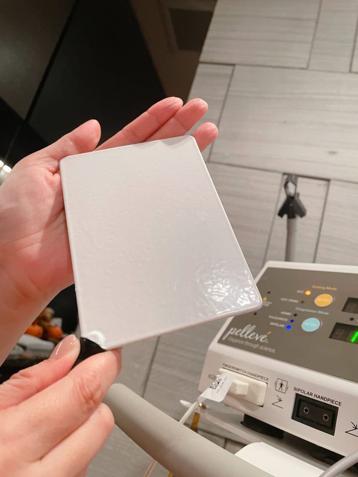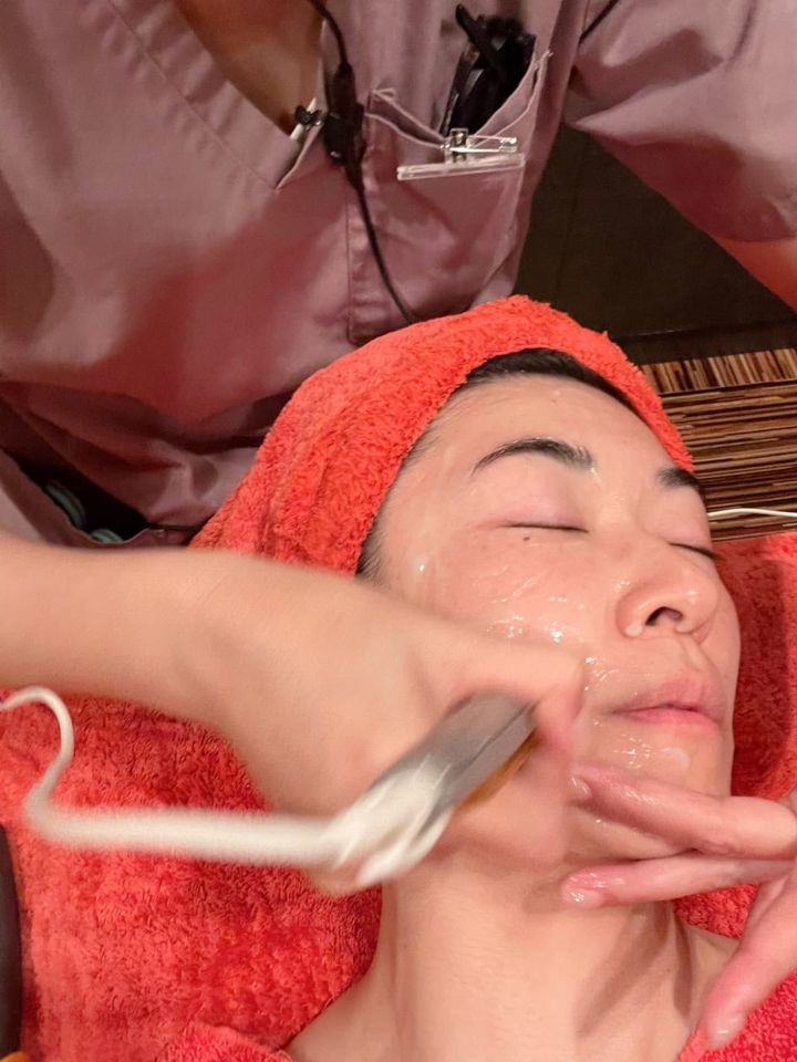 ペレヴェの後は、ジュベルック(水光注射)。スタンプ型の細〜い針で、成分を肌に入れ込みます。針は極細ですが注射ではあるので、最初にしっかり肌表面に麻酔をします。