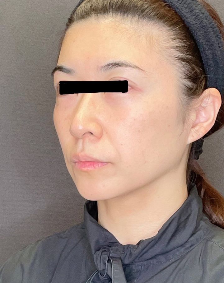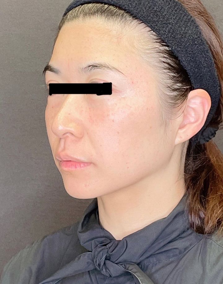 施術の直後なので、どーしても赤みがあるので比べにくいですが、目の下の凹み感やほうれい線が薄くなった感、伝わりますか?
