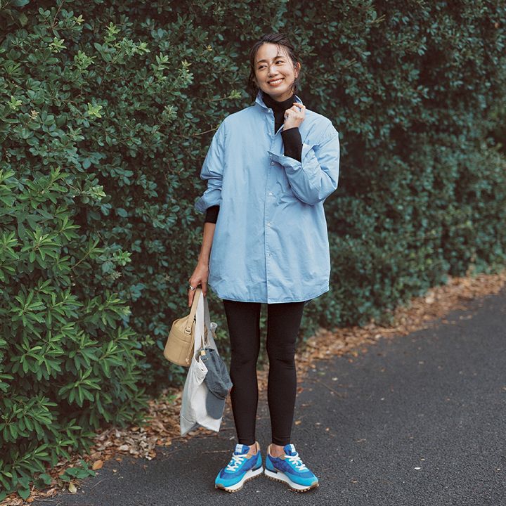 ダウンシャツ¥66,000(ミフュー)中に着たニット¥24,200(ツル バイ マリコ オイカワ)レギンスパンツ¥28,600(ウォルフォード/リトルリーグ インク)ピアス¥19,800〈リラ〉右手人差し指リング¥19,800〈サム バイ リラ〉(ともにリラ/スピック&スパン ルミネ有楽町店)トートバッグ¥8,580(SEA/エスストア)バッグにつけたキャップ¥8,580(ブルースセントリック/メイデン・カンパニー)ハンドバッグ¥31,900(イアクッチ/イアクッチ 大丸東京店)スニーカー¥30,800(ノヴェスタ/ノヴェスタ ジャパン)