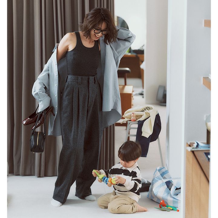 シャツ¥34,100(インディビジュアライズド シャツ/メイデン・カンパニー)ニットタンク¥28,600(ピセア)パンツ¥36,300(ザ シンゾーン/シンゾーン ルミネ有楽町店)メガネ¥62,700(ボッテガ・ヴェネタ/ケリング アイウエア ジャパン カスタマーサービス)バッグ¥110,000(ウィズグッドシューズ/エストネーション)手に持ったパンプス¥30,800(銀座かねまつ/銀座かねまつ6丁目本店)その他(スタイリスト私物)