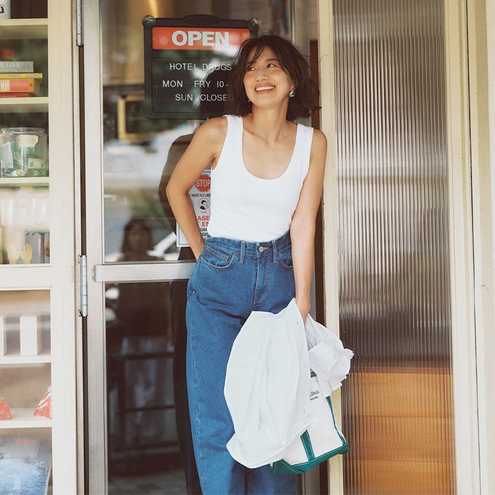 手に持ったシャツ¥46,200〈ローエ〉タンクトップ¥14,300〈フローレ フローレ〉(ともにエスケーパーズオンライン)デニムパンツ¥27,500(オネスト/ノウン)ピアス¥42,900(アサミフジカワ/ショールーム セッション)バッグ¥14,300(エルエルビーン/ロンハーマン)