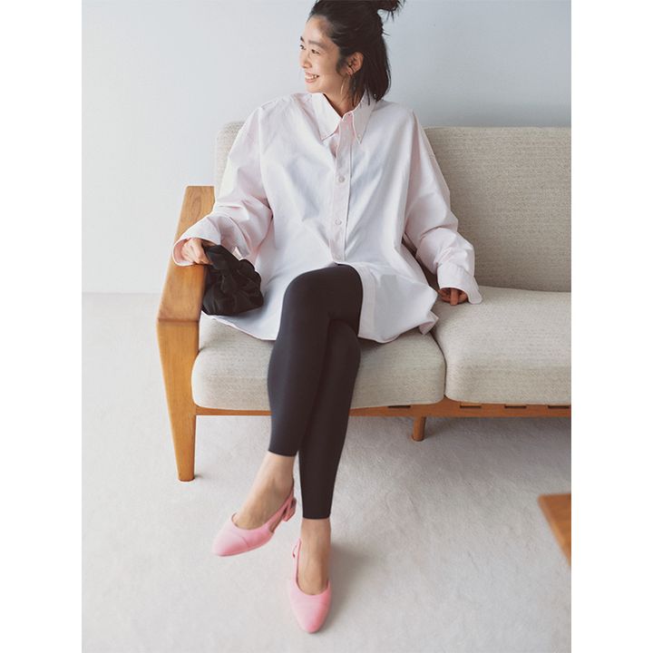 薄いピンクやブルー、イエロー…普段は取り入れない甘色もシャツなら気恥ずかしくなく着こなしの幅を広げてくれます。ひっつめ髪にレギンスでも『それなり』に整えて、カフェくらいは行けそう!