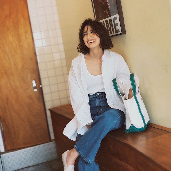 オーバーサイズのシャツがオール白コーデの照れ臭さを軽減してくれる