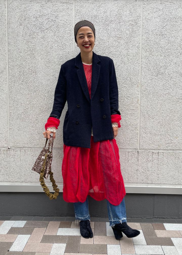 「いつもなら少しおとなしめに着るジャケットスタイルから脱して、赤が印象的な秋冬らしいニットを合わせてみました。さらにスパンコールのバッグやラメのヘアバンドなど、とことんキラキラの小物で遊んでいます!」