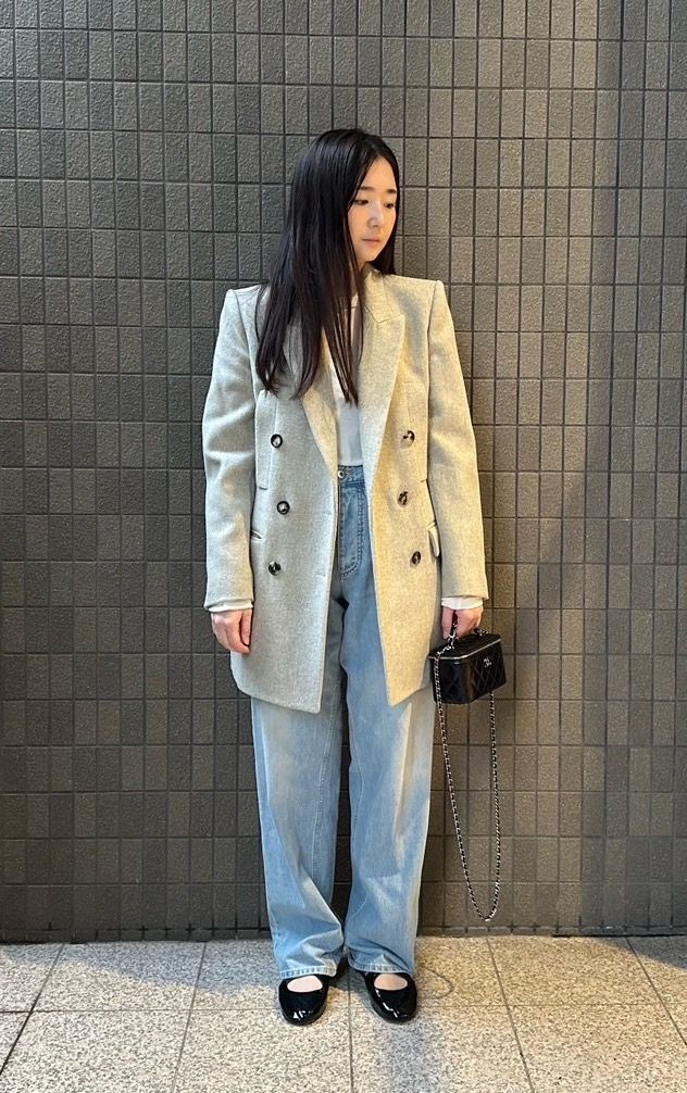 「キレイなシルエットで気に入っているジャケットを、カジュアルに着たかったので太めのデニムパンツを合わせました。バッグと靴は黒にすることで、キレイめな要素をプラスしてスタイリングを引き締めました」