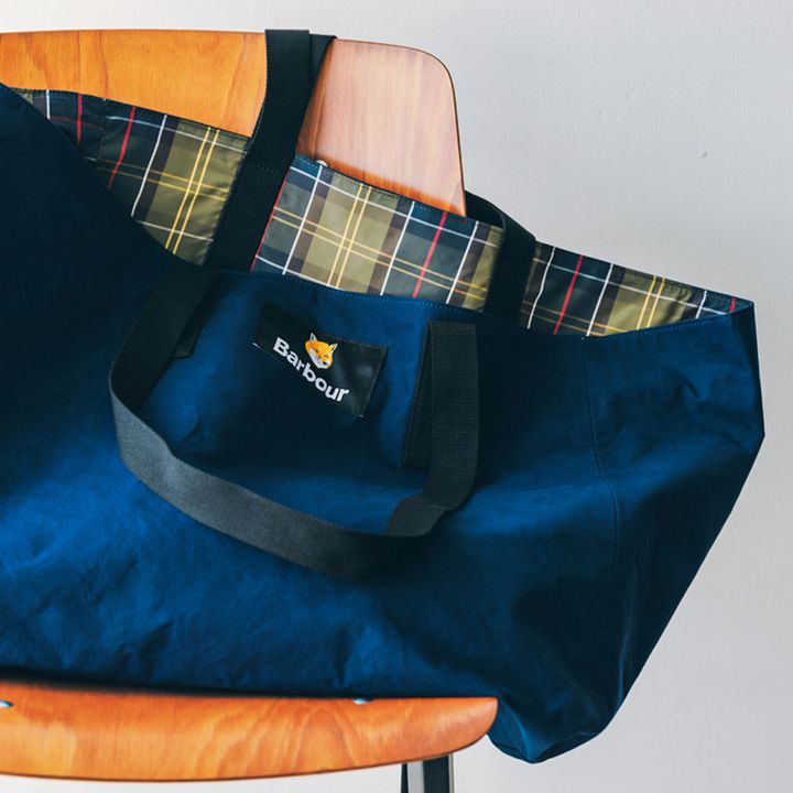 チェック柄を表にしても楽しめる両A面のデザイン。リバーシブルトートバッグ¥25,300(Barbour×Maison Kitsuné/バブアー パートナーズ ジャパン)