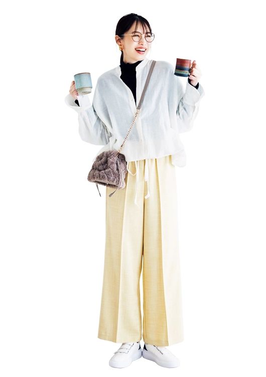 ドロストシャツ¥18,150/リエル リシェ イエローセットアップ(パンツ)¥17,600/ミラ オーウェン ルミネ新宿2店 黒セットワンピース(ニット)¥29,700/emmi(エミ ニュウマン 新宿店) ファーバッグ¥13,200/ノエラ スニーカー¥25,300/ルーニィ メガネ¥1,990/UNIQLO フープイヤリング¥4,950/ジェイデンスター(ココシュニック新宿タカシマヤ店)