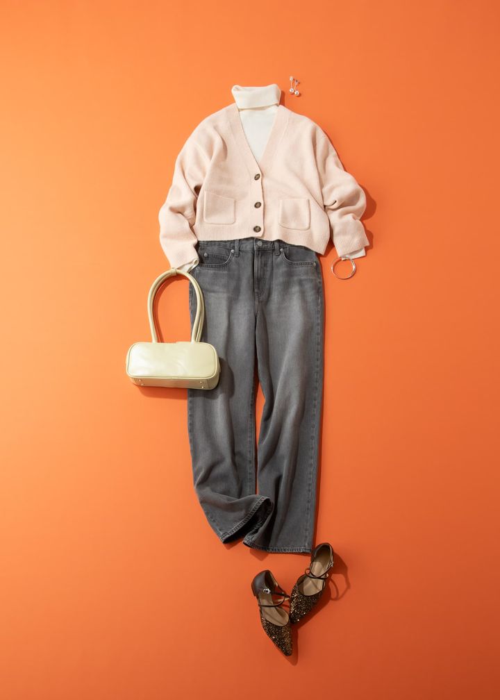 カシミヤタートルネックセーター¥9,990ワイドストレートジーンズ¥3,990(すべてユニクロ)バッグ¥7,260(ル タロン)シューズ¥22,000(オデット エ オディール)ピアス¥13,200<ワンエーアールバイウノアエレ>バングル¥25,300<ウノアエレシルバーコレクション>(ともにウノアエレ ジャパン)