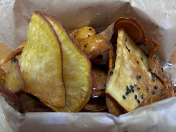 大人気の切揚(きりあげ)はスライスしたお芋をパリパリに素揚げしてたっぷりの自家製の蜜飴と黒ごまをからめています。素揚げしているのでさつまいもの素の味が感じられておいしいです。やめられない、止まらない!あっという間になくなりました。