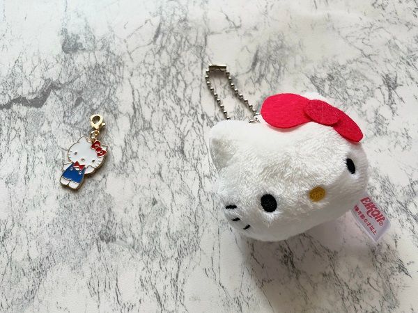 最後は、チャームの紹介です。左は50周年記念チャームで、発売当初のブルーオールオーバー&赤リボンのベーシックなキティちゃん。高見えするのに、なんと!こちらも110円。