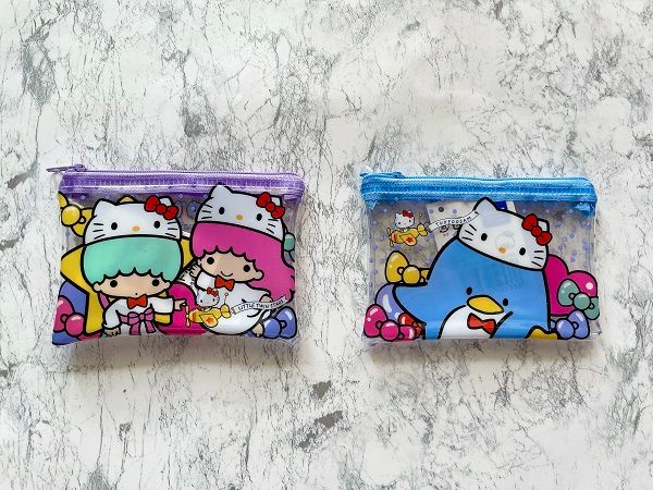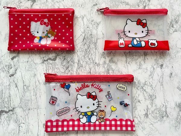こちらはファスナー付きフラットポーチです。上2つは、W120×H75mmサイズ(110円)。懐かしい80年代や70年代の色合いや表情が特徴的なキティちゃんです。下はW160×100mm(110円)表と裏で異なるプリントがされていて、上よりすこし横長のタイプ。アイペンシルやアイブロウなども入れられるので、フラットなお化粧ポーチとしても良さそう。