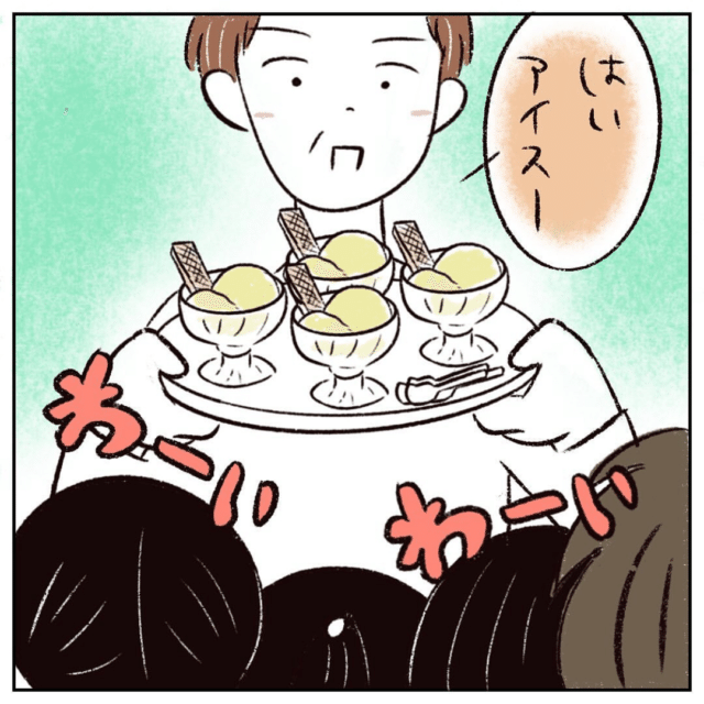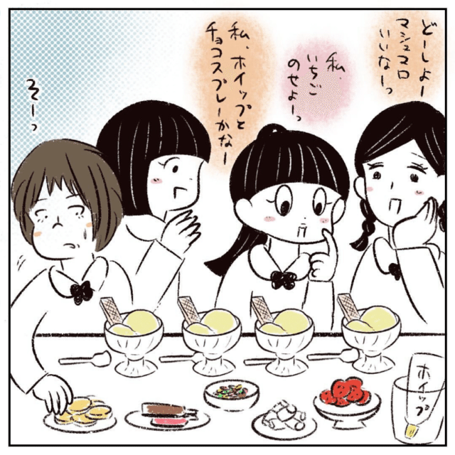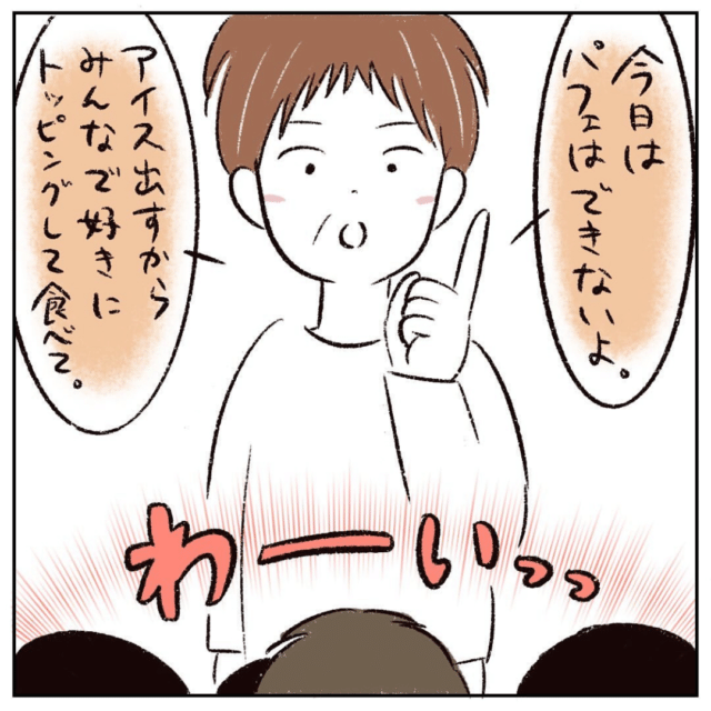 まるさんのお母さんはみんなに「今日はパフェはできないよ。アイス出すからみんなで好きにトッピングして食べて」と伝えるとみんな大喜びです。