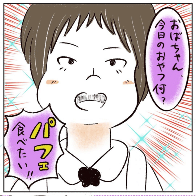 さなかちゃんは挨拶もせずいきなり「おばちゃん、今日のおやつ何?パフェ食べたい!!」と言いました。