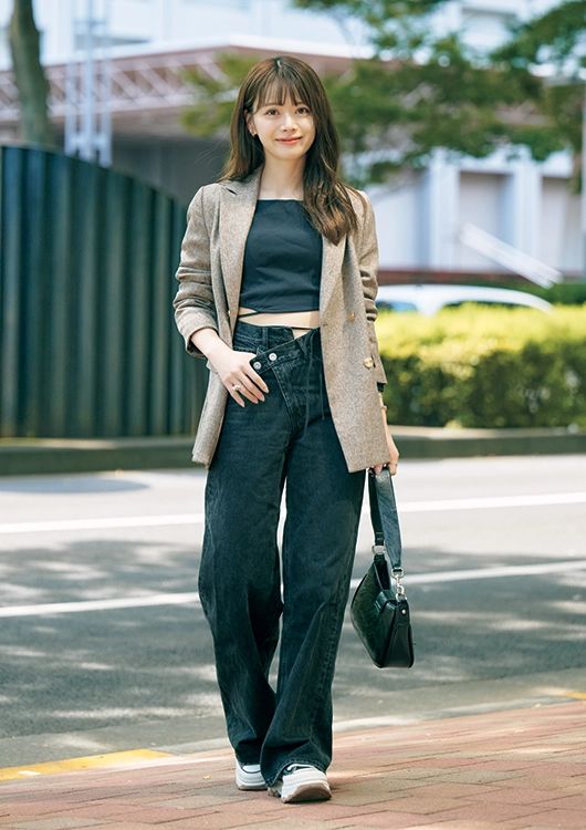 「秋色ジャケットは取り入れるだけで季節感がグンとアップ。長めの丈感なら、羽織るだけでカッコよくキマります。デニムはウエストのデザインが凝っていて◎。フレア&丈長めでスタイルアップも狙えます。クールなアイテムでそろえた分、髪は巻いてやわらかさを出しました」(モデル/山崎春佳さん・29歳)
