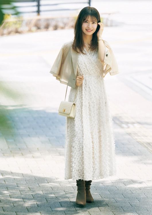 「暑さの残る9月は半袖で体温調節しつつ、秋らしいベージュトーンで統一。FRAY I.Dのワンピースは、秋の訪れを感じるフリンジがポイント!ニットブーツで足元は重ために。ふわふわとした質感とやわらかいベージュで、あたたかみを感じるコーデに仕上げました」(人事/木村咲彩さん・28歳)