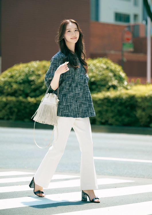 「ツイードトップスに白のパンツを合わせて爽やかに。アニュアンスのパンツは、裾に向かって広がるシルエットがきれいで気に入っています。モードな印象を添えるフリンジバッグをアクセントに。柄で季節感を取り入れつつ、全体をきれいめにまとめました」(法律事務所勤務/川原千里さん・24歳)