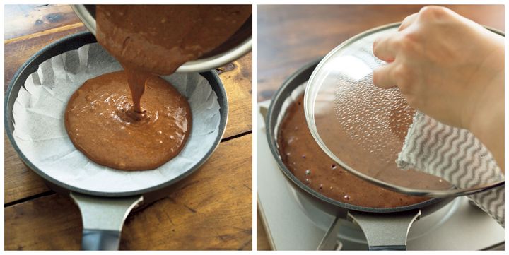 生地をオーブン用シートを敷いたフライパンに流し入れる。ふたをしてごく弱火で30分焼く。途中、ふたの内側に水滴がついたら、ふきんで拭く。焼き上がったらココアパウダーを茶こしを通してふり、ホワイトチョコレートを一口大に割ってのせる。