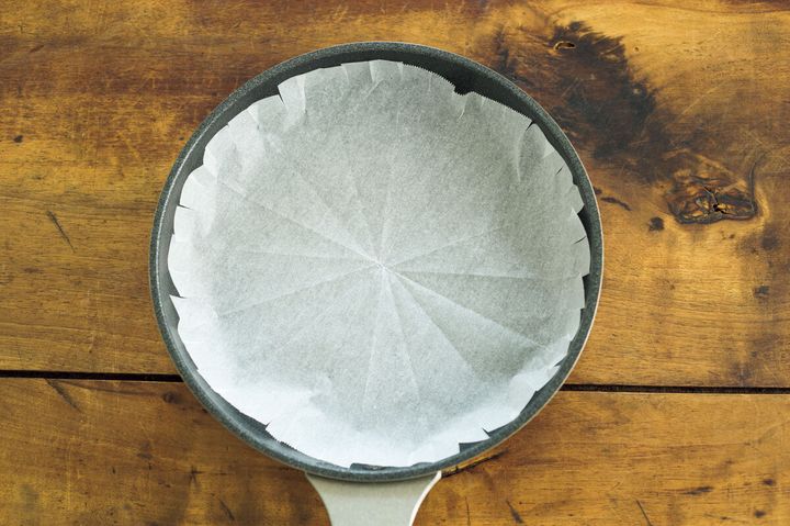 (1)オーブン用シートを20×20cmに切る。4つ折りにしてから斜めに2回ほど折り、フライパンの縁に合わせて端を丸く切って、扇形にする。