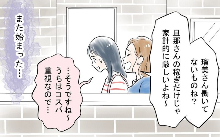 家が隣同士で子どもが同じ保育園の瑠美と京子。瑠美が現在働いていないことを知ってから京子は急に態度を変え、会うたびに「専業主婦だからね〜」と何かしら嫌味を言ってきます。