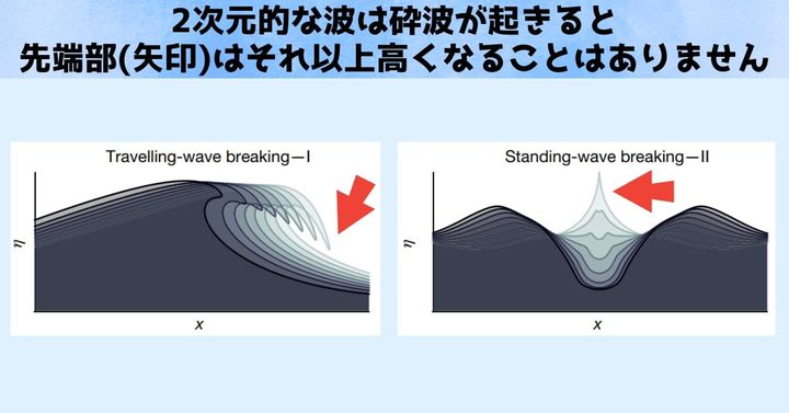 実際、現実世界で現れる波は2次元的なモデルで予測されるよりも遥かに急な傾きになることが知られています。