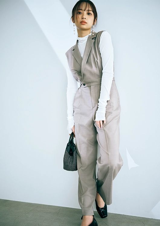〝おしゃれの奥行き〟が出せる、レイヤードテク。初秋はオールインワンに薄手ニットを重ねて、キレイめキープで更新を。