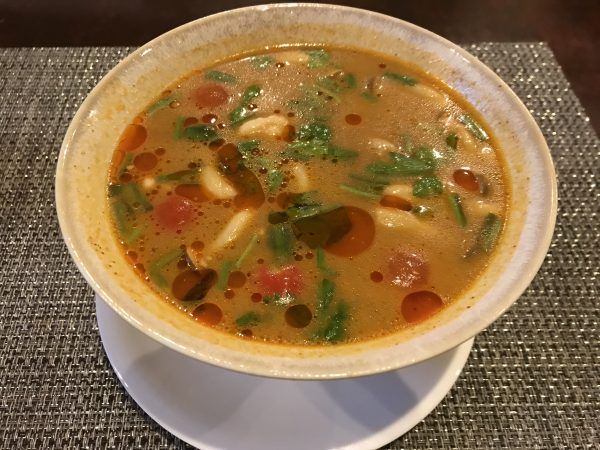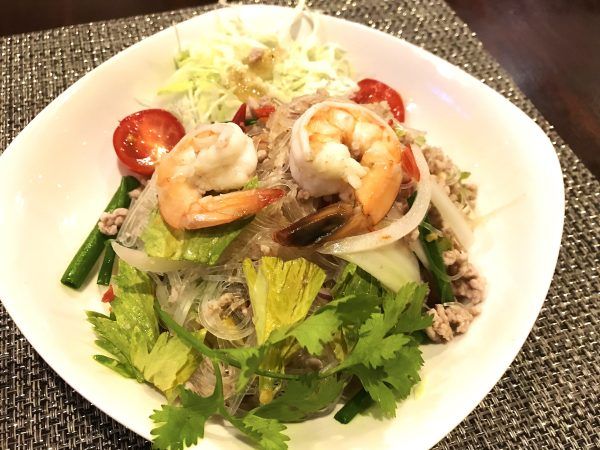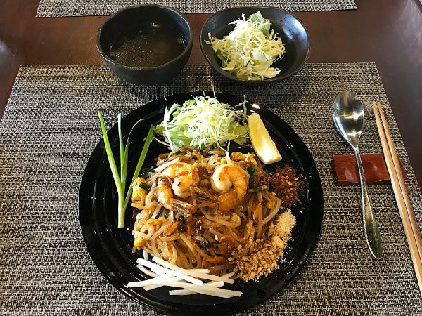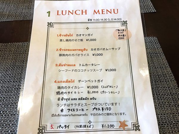 サラダとスープがつき、1000円(平日のみ)とリーズナブル。 カオマンガイもグリーンカレーもおいしく、いつもどれにするか迷う。 おや?見かけないメニューがある。一番下のパッタイ(1200円)。 客からの要望で最近加えたものだそう。では、今日はそちらをいただこう。