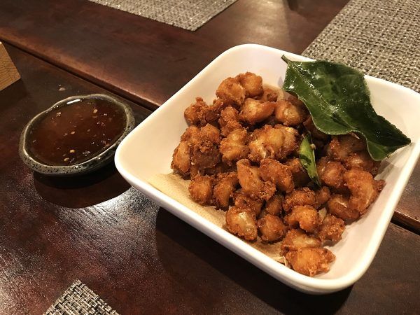 タイブランドのシンハービールやチャーンビール、ワイン・ハイボールなどのお酒もある。 たまたま隣席にいらした店主のお義母様から勧められた「軟骨のから揚げ」は、ビールのつまみに最高だ。添えられた緑の葉っぱの、レモングラスのような爽快な香りがたまらなくよく、これもビールとよく合う。