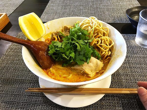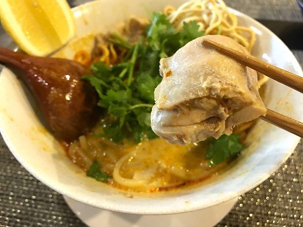 ランチメニューではないのだが、お腹いっぱいになりたいのならカオソーイがおすすめ。 カオソーイは知らない人も多いと思うが、ひとことで言うなら、カレーラーメン。 ココナッツの甘みと程よい辛さのレッドカレーベースのスープに、茹で麺と揚げ麺のダブル麺。チキンもごろごろたくさん入っているから、腹パン間違いない。 パクチー追加はマスト。味に飽きてきた後半は、レモンを絞って味変を楽しもう。