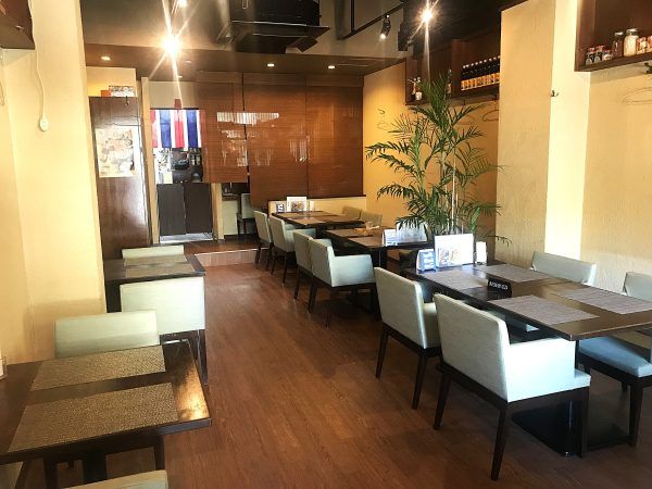 店内は6人席が1つ、4人席が3つ、2人席が2つ。席間をゆったり取っているので、隣にグループ客が来ても気にならない。 椅子は贅沢にも、個別のアームチェアになっている。 TVモニターからはタイのミュージシャンだろうか、ここが日本であることを忘れさせるように、ミュージックビデオが流れる。