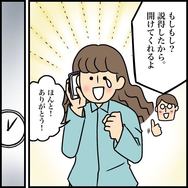 そしてその後、「もしもし?さっき説得したから開けてくれるよ」「ほんと!ありがとう!」パパからの説得完了の電話にホッとしたママ。