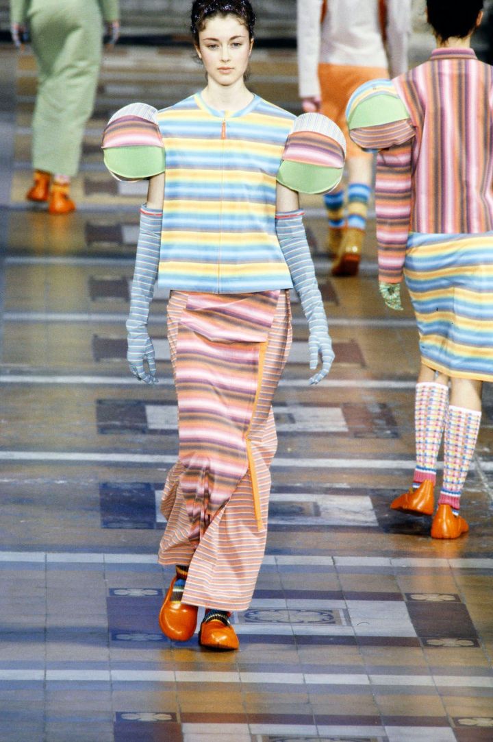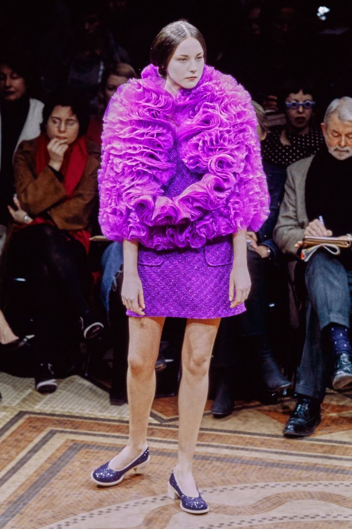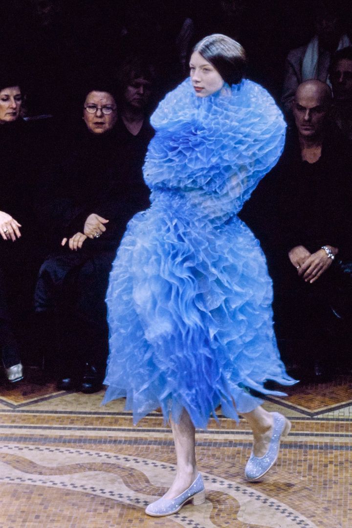 ジュンヤ ワタナベJUNYA WATANABE)の2000年秋冬は、「テクノ・クチュール」という表現が最適な全29ルックを披露。ブルーやパープル、イエロー、ピンクなど強い個性を放つカラフルなパレットに幾重にも重ねたチュールやラッフルを合わせて、オートクチュールのように繊細な手仕事をディテールの随所に施した。