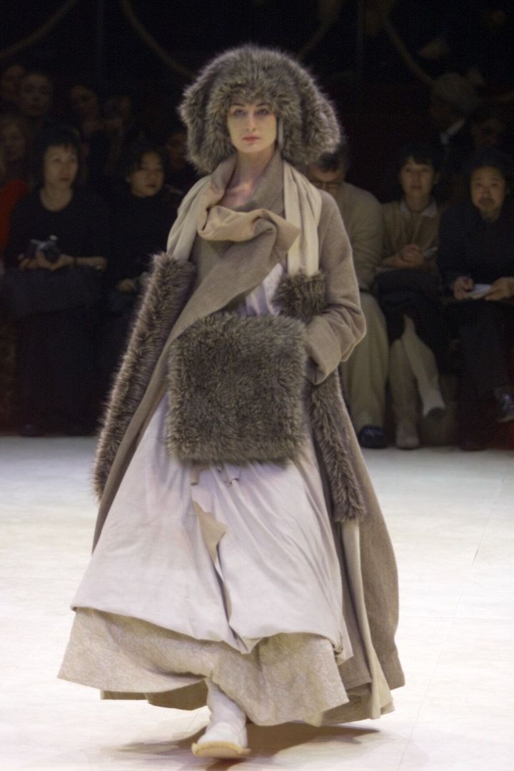 ヨージヤマモト(YOHJI YAMAMOTO)の2000年秋冬コレクションは、極寒の冬を贅沢に包み込むようなルックが多数見られた。ネイティブアメリカンや遊牧民族のウェアを連想させる、詩的でノスタルジックなムードは今見返しても美しい。フードや襟にキツネやオオカミのファーを使い、それらのファーはパッド入りのクリノリン・スカートの裾にもあしらわれていた。民族的なムードに加えて、アンティーク調のペイズリー柄も登場。