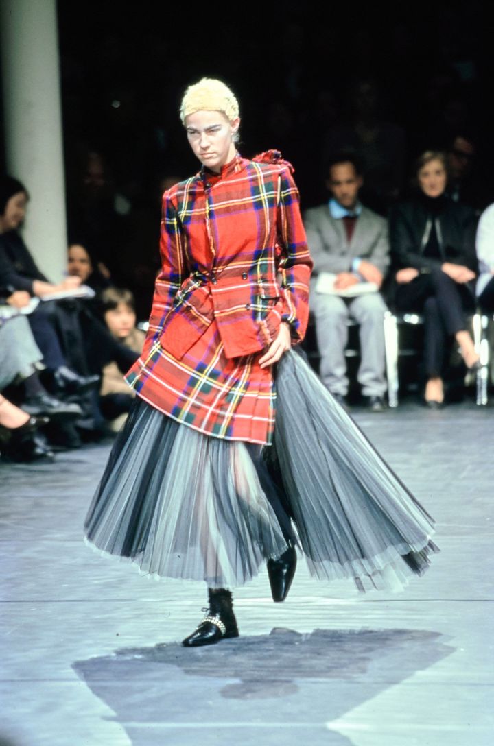 コム デ ギャルソンCOMME des GARÇONS)2000年秋冬コレクションのテーマは、「Hard & Forceful」。パンク精神への賛歌として、タータンチェックを中心にボンデージスタイルのストラップ、ブラックレザー、スタッズを多用。「ロイヤル・スチュワート」のチェック柄ジャケットとフルチュールのスカートの組み合わせは、ニュールックを連想されるシルエットに仕上げていた。