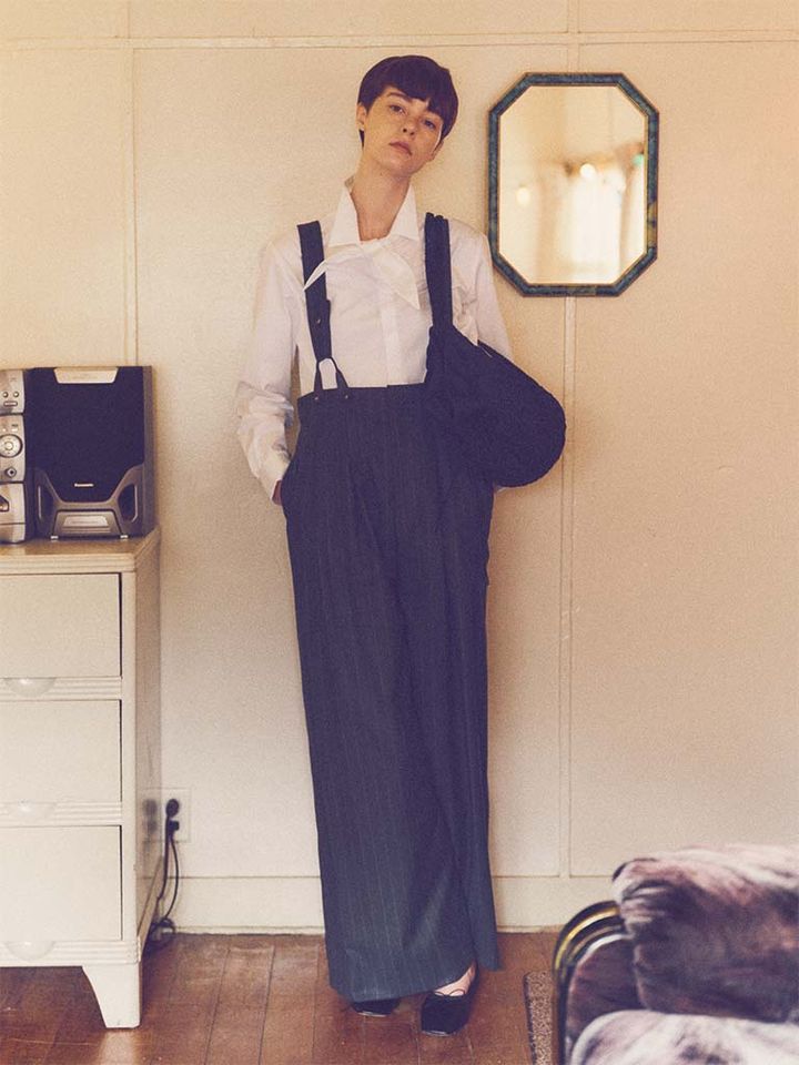 【POINT】トラッドな白シャツとセットでも力が抜ける、あり余るほどのぶかっと感。サスペンダーつきのウールパンツというわかりやすいクラシック感も、シルエットがハズしとなってフランクに。