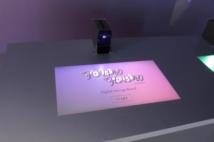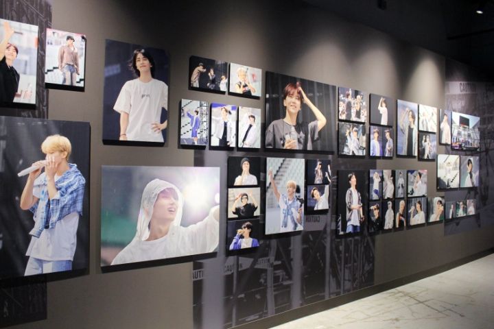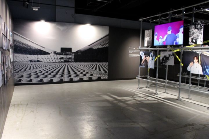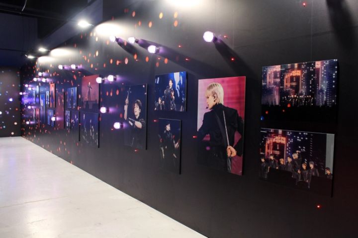 スクリーンの反対の壁一面には、スタジアム公演でのメンバーの写真が展示されています。