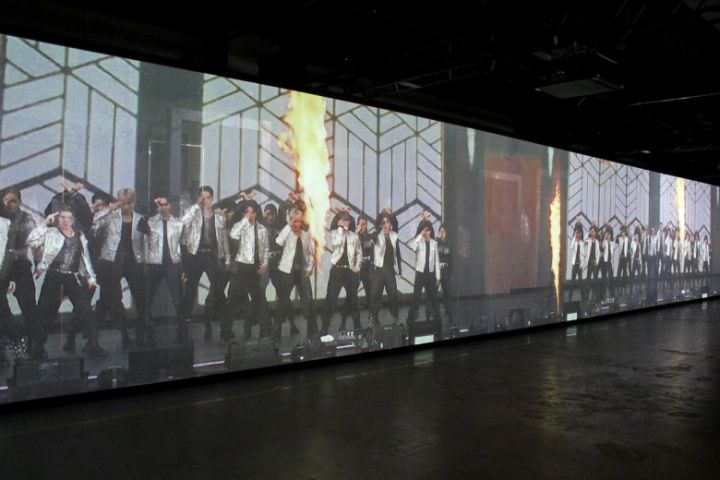 舞台裏の骨組みを抜けると、全長約20mのスクリーンでスタジアム公演のメンバーの登場シーンを観覧できます。