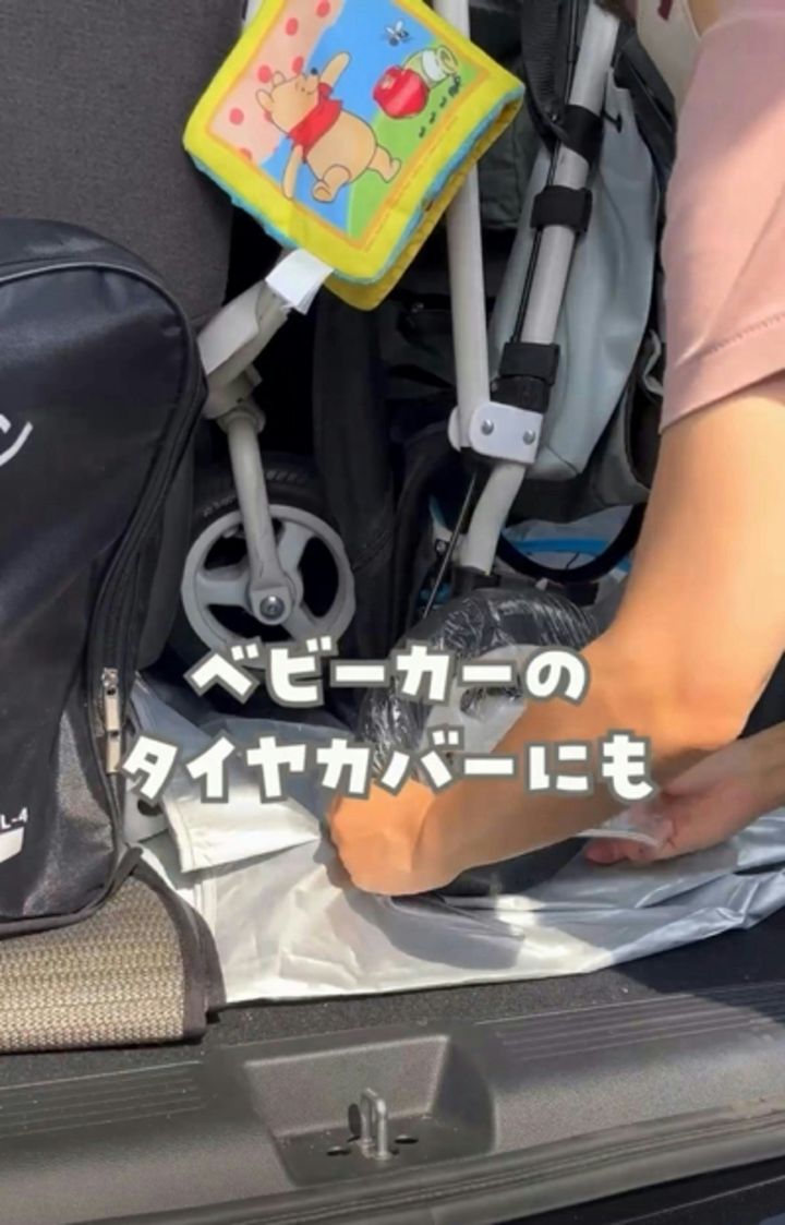 ベビーカーのタイヤのカバーにも、シャワーキャップが便利。車に積み込むとき、ベビーカーのタイヤに付いた汚れが気になりませんか?そんなときは、シャワーキャップをタイヤに付けてから積み込めば、車にタイヤをつけずに済みますね。