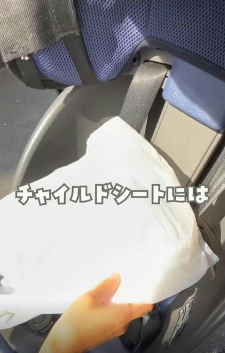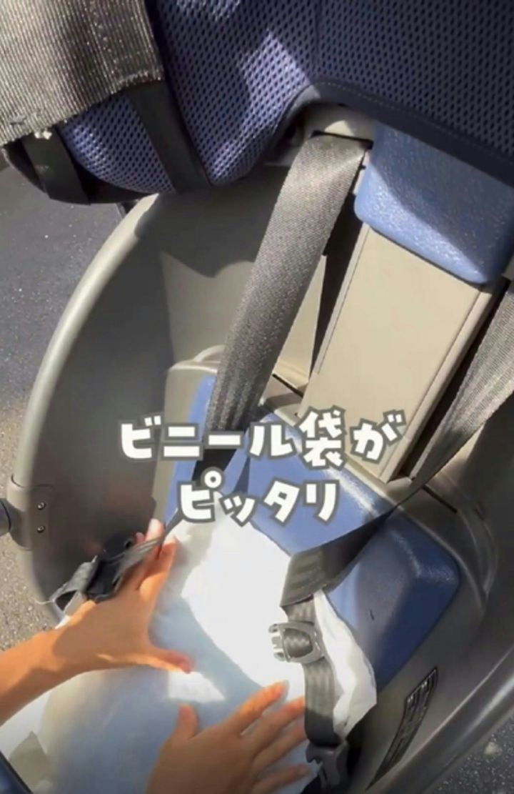 チャイルドシートにシャワーキャップは使えませんが、ゆみ|ワンオペ×ストレスフリーな育児さんはビニール袋を使っているそう。ビニール袋も常備しておけば、シートの部分を覆って子どものおしりもガードできます。