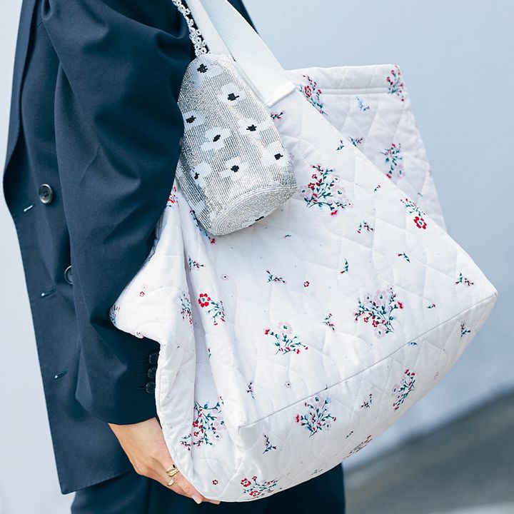 大容量でこれ一つでなんでも入って解決してくれるHOLIDAYのサブバッグは平日の通勤、子どもの送迎に大活躍。迷子になりがちな鍵や財布はオールハンドメイドのpura utzのビーズバッグに。それぞれブランドや素材は違えど花柄をセットで持つと可愛さが倍増♡