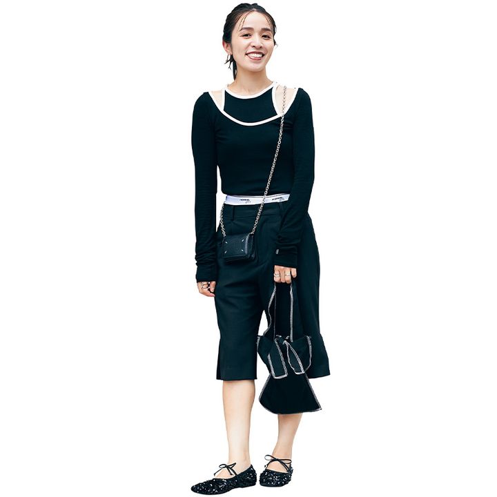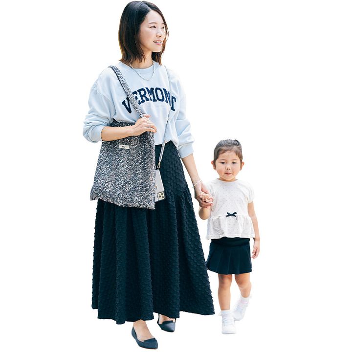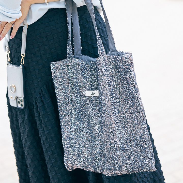 Uhrのサブバッグは普段子どもとの公園遊びやお迎えに重宝しています。3人育児中のため、軽くて伸縮性のある素材感は急な子どもの「荷物持って~」にも幅広く対応してくれます。また、スパンコールのキラキラがカジュアルなモノトーンコーデを華やかに見せてくれて◎。